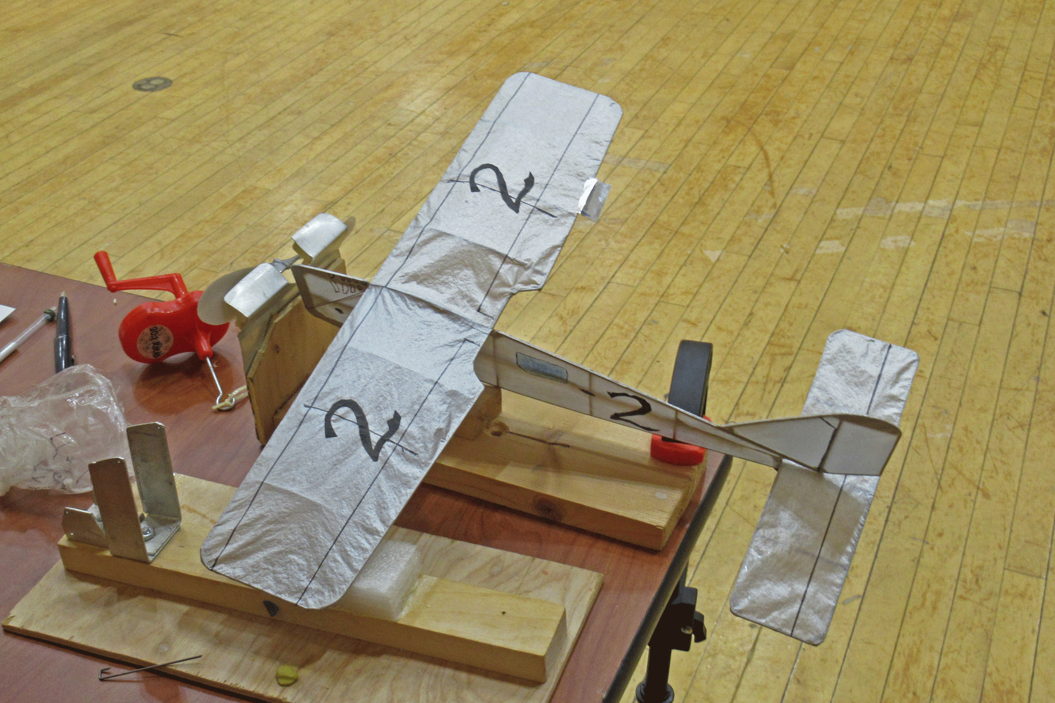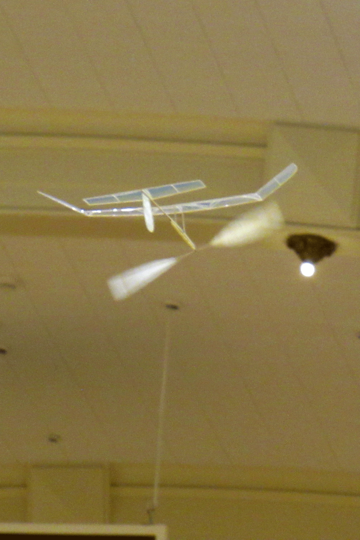 There were three Bong Eagles flying at Racine on March 6. Jeff A. was flying his planes for F1L and A6 competition. He also got his “Stringless Wonder” to fly well (64 seconds). This flying Kite from Bill Hannan plans was a one design contender at the EAA Flight Fest. Chuck M. had great flights with an impressive Limited Penny Plane. He also coached the Science Olympiad fliers. Joe B. brought his new Jetco R.O.G. model and a new Stringless Wonder. He was able to get the trimming process started. There were also a number of Science Olympiad flyers from 3 Wisconsin schools. They successfully tuned up their models. Jeff A. and Joe B. contributed photos.