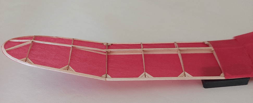 In May 2024, I started building an Embryo model called the Go Devil, a Herb Kothe design and short kitted by Volare models. After finishing all the frames and getting ready to cover the wing I noticed that the wing was quite wimpy and flexible. I could see this wing folding at the flying field with the slightest of wind gust blowing through. Per design, this wing only has a single 1/16 square spar which may work but just didn’t feel very robust to me. So I updated an analysis spread sheet program for wing spar design which have used on several other models which I have built over the years. Assumptions for this analysis are that bending wing load is taken by the main spar with little or no contribution from the tissue covering. The wing is broken up into several panels to approximate the wing plan form shape. I usually start by calculating the bending moment and stress at the wing center which is the reference distance to the inner chord of each panel. One can then proceed to repeat the same analysis at various points along the wing where a different size spar or density wood may be used. For wind gusts I select a maximum lift coefficient of about 1.5 and a wind velocity of 15 mph for the embryo wing. On larger rubber models I would design for higher wind gust of velocities of 20 to 25 mph. It just depends on how much margin you want with the particular wing design.