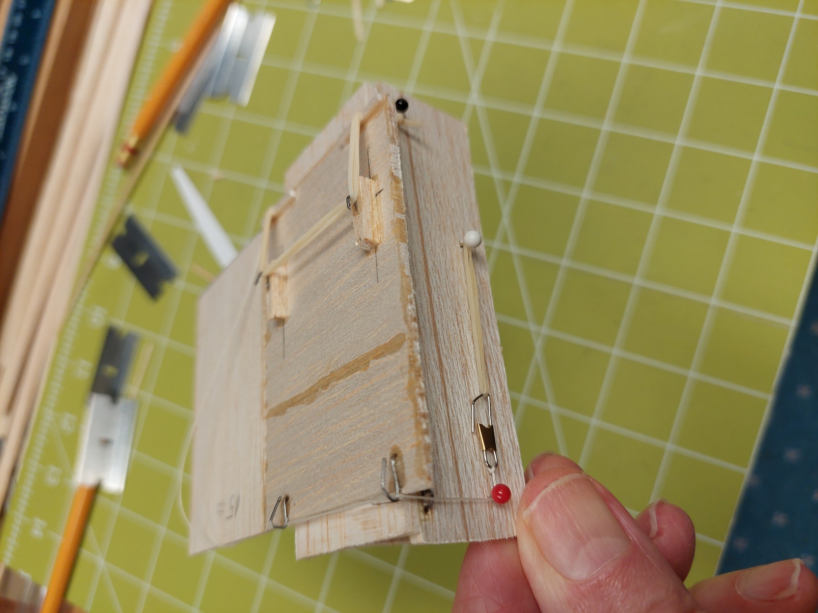 A proof-of-concept prototype was then made out of scrap balsa to evaluate this design. Everything worked fine except the trailing edge bands did not have enough torque to lift the wing into the DT position. This issue was resolved by adding a 1/16 square balsa strip at the wing trailing edge. By doing this, the band tension vector force angle was changed to increase the pulling torque applied to the pivoting wing. The following photos show the proof- of- concept proof type and the DT system in both flying and DT positions.