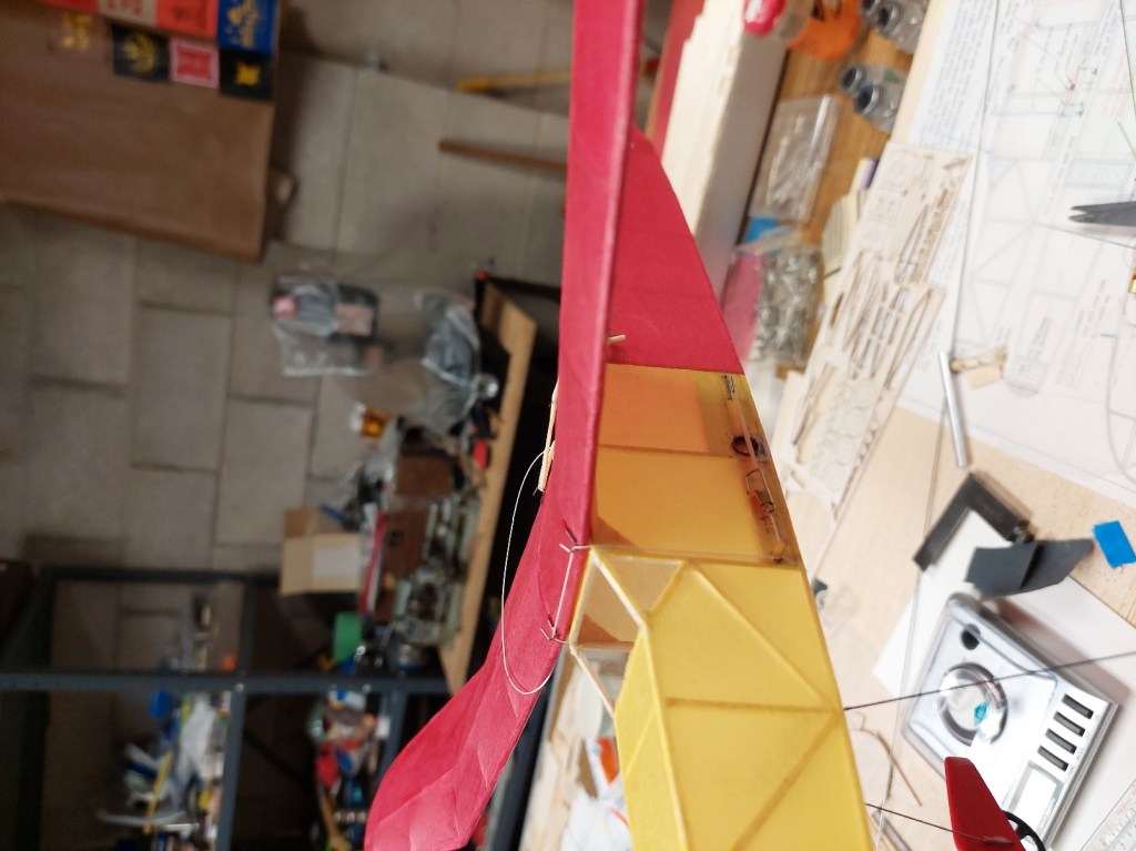 Following is a description of the DT system developed: The wing pivots about the trailing edge which is back stopped by a 1/16 square balsa strip glued to the fuselage. Two hooks are attached to either side of the fuselage and two more hooks are glued to ribs about 1 inch ahead of the trailing edge. A rubber band is then stretched from one side of the fuselage, around the two hooks on the wing, and back to the opposite side of the fuselage. Both fuselage hooks are positioned such that the wing trailing edge is pulled back and down against the stop. The wing leading edge is secured with two additional hooks glued to ribs on either side of the fuselage and on the wing leading edge. A line then runs from the opposite side of the fuselage, thru the two hooks on the wing leading edge and around a post on the bottom fuselage side. A DT band is attached to the end of this line and stretched to another hook on the fuselage side. This design rigidly secures the wing at two points on the leading and trailing edges. A wing DT limit line is looped over the wing and attached to the fuselage side at the edging edge and trailing edge locations.
