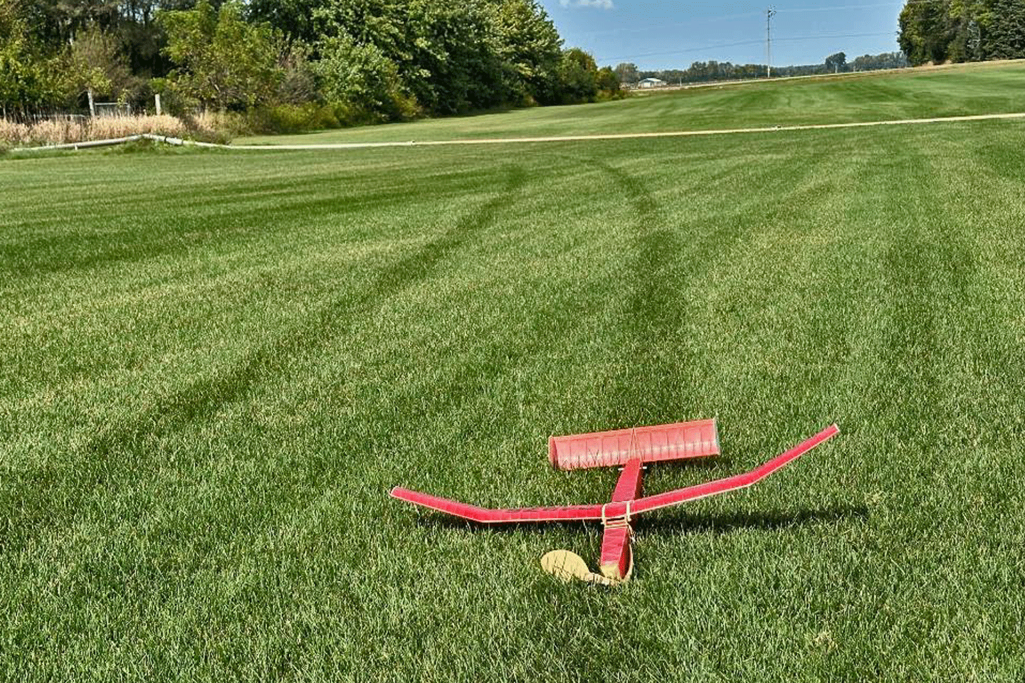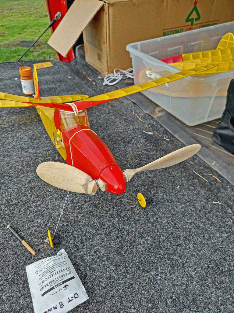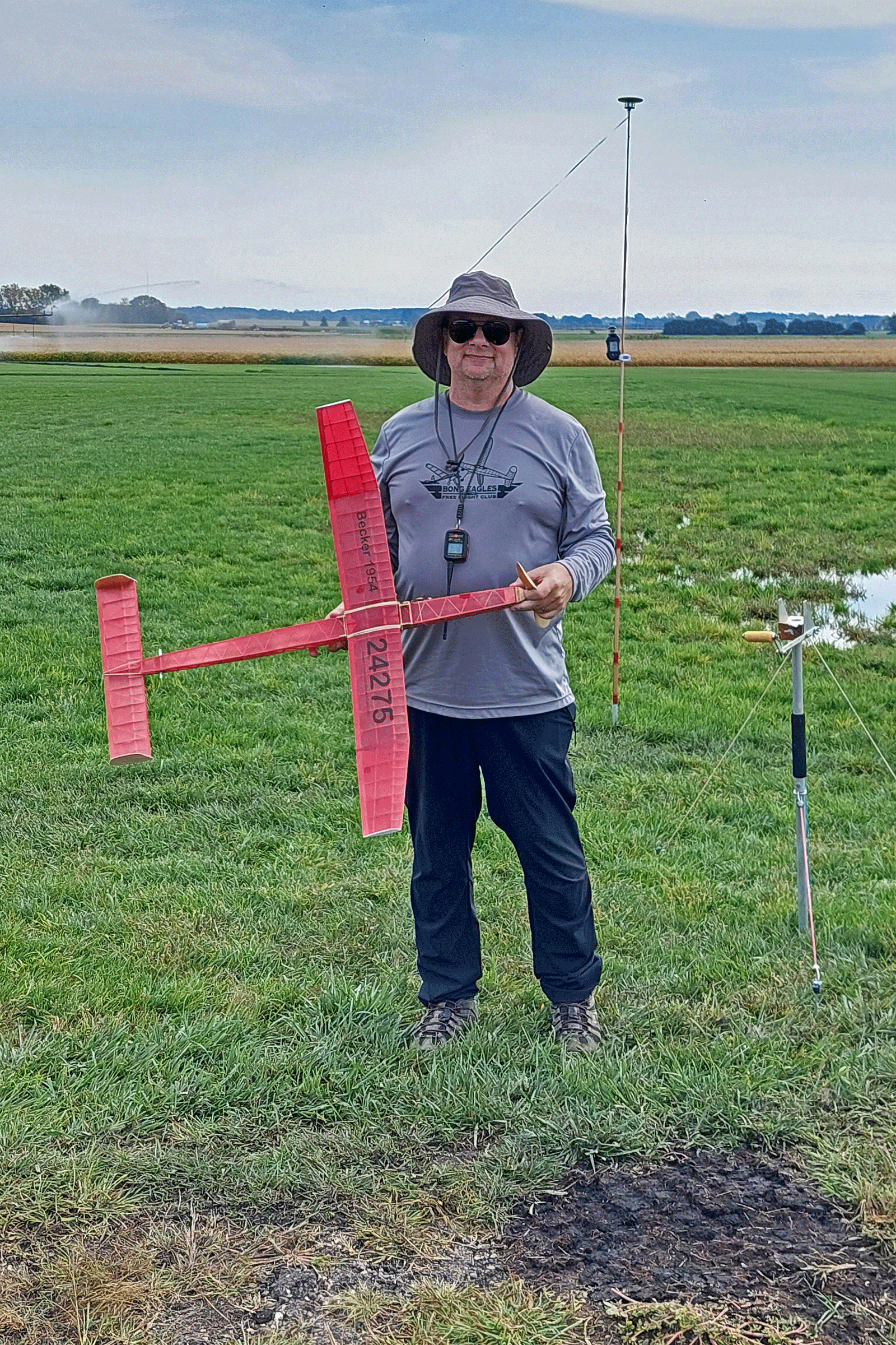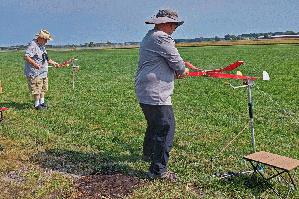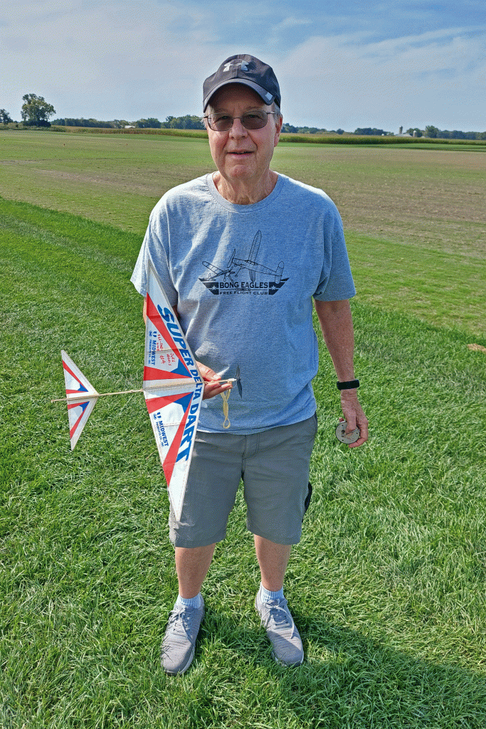 The fun fly scheduled for Saturday 9-14-15 was moved to Sunday due to predicted slightly lower wind velocities. The weather turned out to be beautiful on Sunday with Sunny skies, warm temperatures in the low 80’s, and wind out of the South to South-East 4 to 7 mph. Steve Pollina had just finished his Sparky and started putting in some initial test flights, which all flew well. Steve improved the flight path by incrementally adding some right thrust to make the model turn better under power. Steve is a master builder with his new Sparky beautifully detailed with outline colors, custom-made decals, vacuum-formed spinner, electronic DT, and GPS locator. Mike Kirda continued trimming his Becker oldtimer stick model and had some outstanding flights of around 400 ft. altitude per his GPS altimeter readings. This model is also equipped with RDT allowing Mike to overfly trees and hazards before tripping the DT in a safe landing zone. Jim continued to work on trimming one of his many P30 models. Jeff attended to take photos and trim his Super Delta Dart which doesn’t fly too far as he is still recovering from rotator cuff surgery.