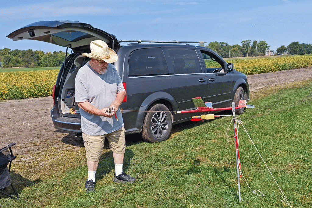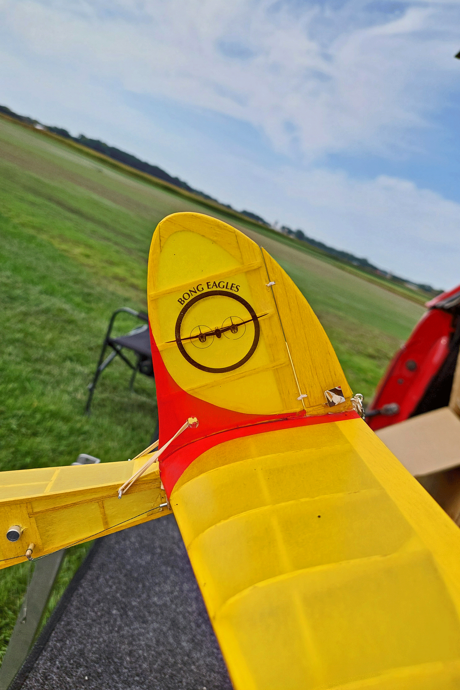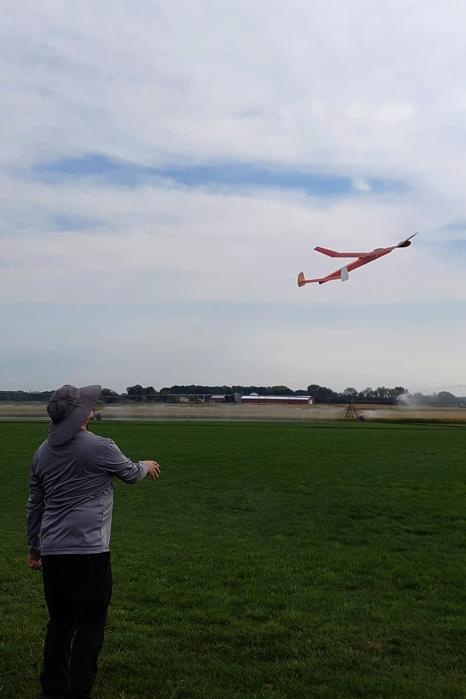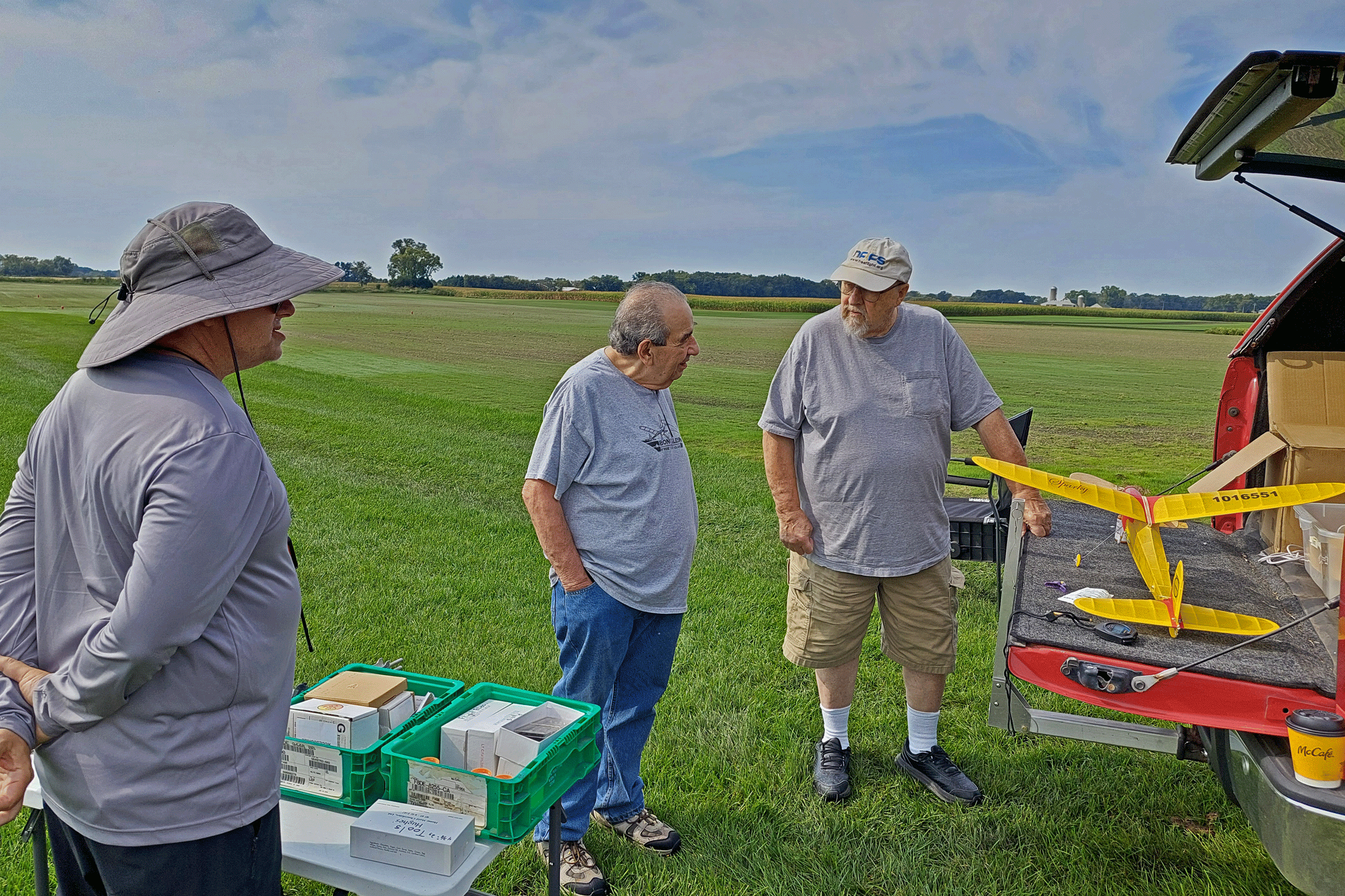 The fun fly scheduled for Saturday 9-14-15 was moved to Sunday due to predicted slightly lower wind velocities. The weather turned out to be beautiful on Sunday with Sunny skies, warm temperatures in the low 80’s, and wind out of the South to South-East 4 to 7 mph. Steve Pollina had just finished his Sparky and started putting in some initial test flights, which all flew well. Steve improved the flight path by incrementally adding some right thrust to make the model turn better under power. Steve is a master builder with his new Sparky beautifully detailed with outline colors, custom-made decals, vacuum-formed spinner, electronic DT, and GPS locator. Mike Kirda continued trimming his Becker oldtimer stick model and had some outstanding flights of around 400 ft. altitude per his GPS altimeter readings. This model is also equipped with RDT allowing Mike to overfly trees and hazards before tripping the DT in a safe landing zone. Jim continued to work on trimming one of his many P30 models. Jeff attended to take photos and trim his Super Delta Dart which doesn’t fly too far as he is still recovering from rotator cuff surgery.