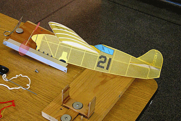 No Cal or Profile Scale planes are built with a simple framework showing the side view of the aircraft they represent, attached to a motor stick which carries the propeller bearing and the rear motor hook. The wing is covered on one side and usually has cambered “sliced” balsa ribs. This splendid example represents the “Chambermaid” pylon racer and was flown at a 2010 Meet at Racine’s Memorial Hall, There are a wealth of plans available for such planes, either in “Model Aviation” or in the Flying Aces Newsletter archives. Short kits are available at retrorc or Volare Products.