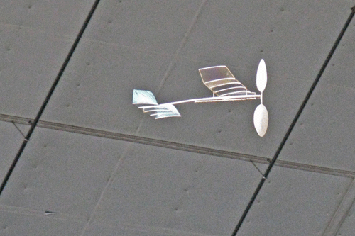 This class is the most challenging of the film covered planes, with film covered variable pitch propellers only one of the sophisticated means used to reach 20 minute flights indoors. Wing span maximum is 550 mm (21.7 inches) and wing chord maximum is 200 mm (5.1 inches). Minimum weight is 1.4 grams for the airframe. Motor maximum weight is 0.4 grams. Wing loading for the 0.77 square foot wing would be 0.083 ounces per square foot, and cube loading would be a gossamer 0.094 ounces per cubic foot.