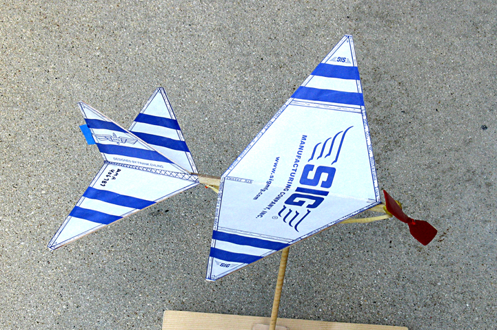 The Delta dart is a very simple aircraft with a stick for a fuselage and flying surfaces with thin graph paper covering over a framework of 1/16 X 1/8 inch balsa sticks. A 5 3/8 inch diameter plastic propeller comes with the kit. The Bong Eagles fly them in “Mass Launch” = last down wins contests both indoors and out.